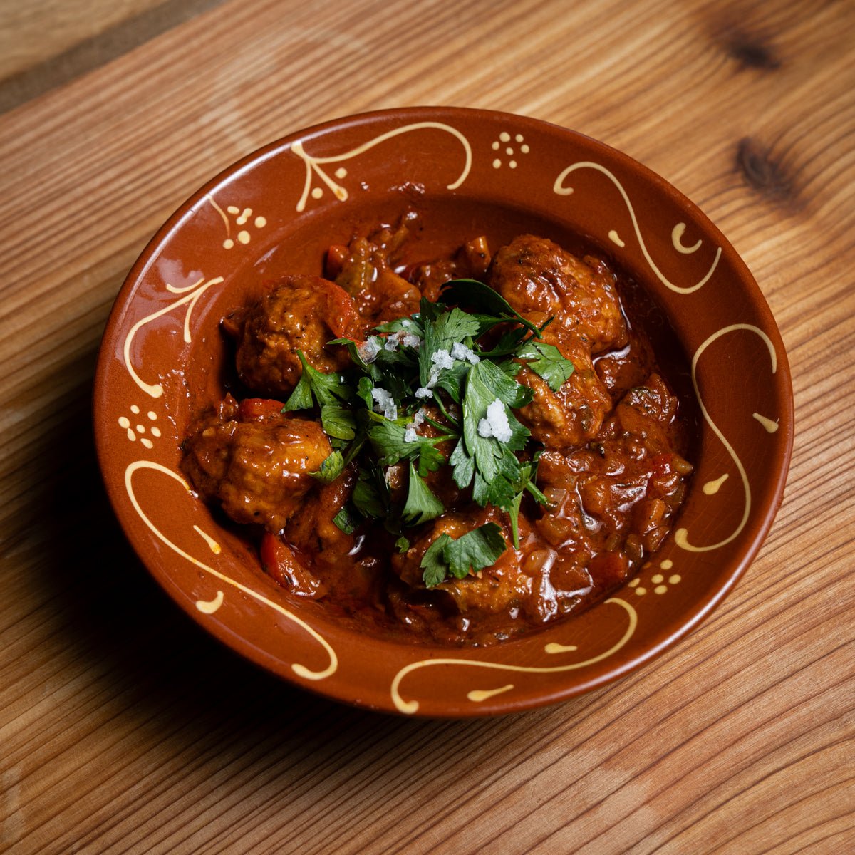 - Små kycklingbullar i en traditionell tjock och smakrik tomatsås