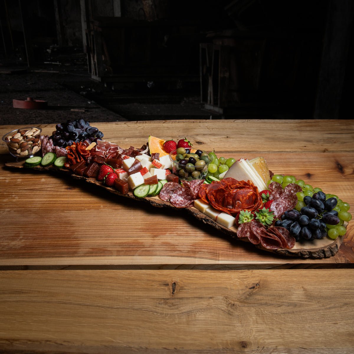 Leverans på plankor : Menyn kan även levereras på våra vackra ekologiska träplankor, där vi tar hand om presentationen, dekorerar med färsk frukt och grönsaker och levererar direkt till bordet där du vill att maten ska stå.